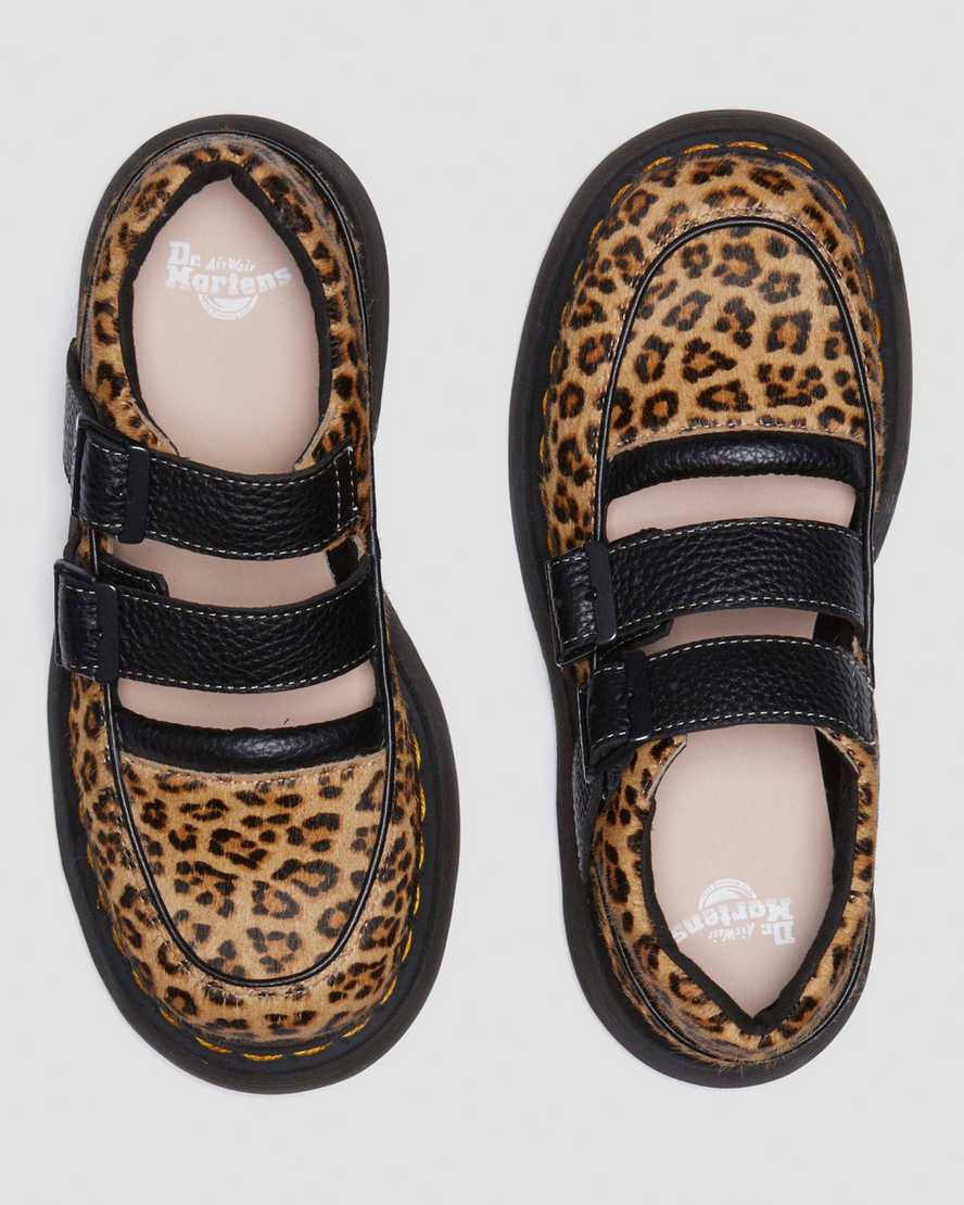 Buzzing from the sole up. The Buzz Mary Jane shoe stands on our new inflated Buzz sole. A barrel-edge PVC platform marked with DM??s grooving, yellow welt stitching, and a leaf pattern on the undersole. The upper is made from leopard print Hair On leather with a comfortable padded collar. Fastened with 2 adjustable leather straps with branded clasps.