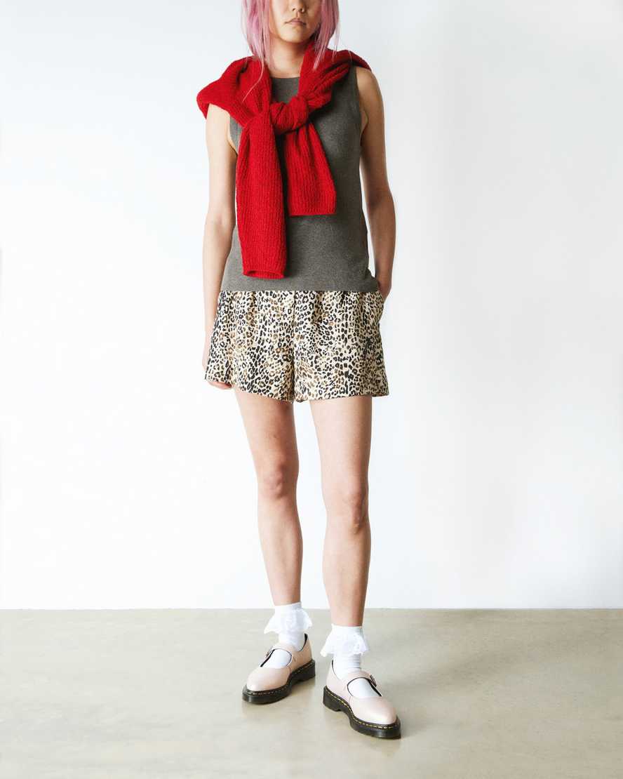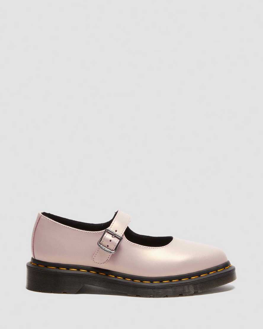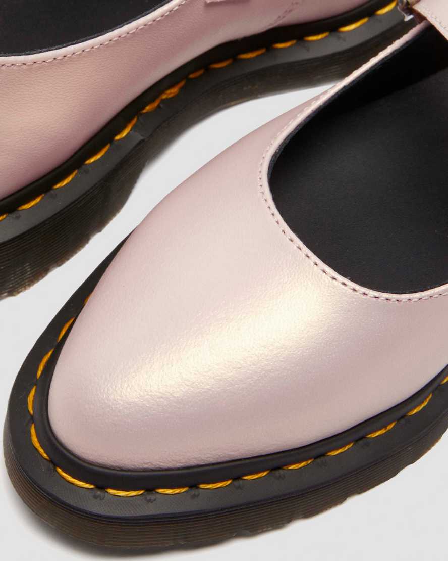 Get to the point. The Elphie ballet flat is our twist on a classic. Less dainty. More Doc??s. A pointed ballet flat shoe made from powder pink Shift leather with an iridescent finish. Fastened with a single strap with a DM??s branded buckle. The tapered sole is marked with DM??s signature grooving pattern and secured with yellow welt stitching.