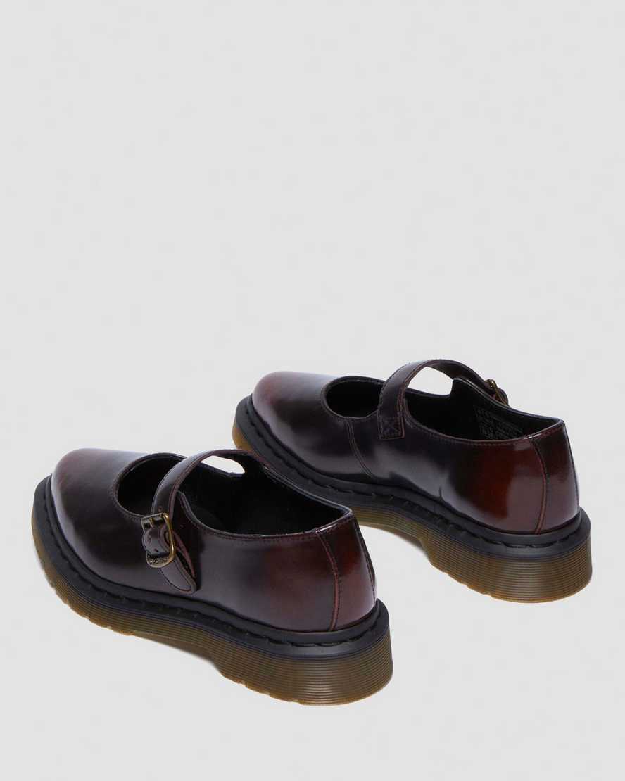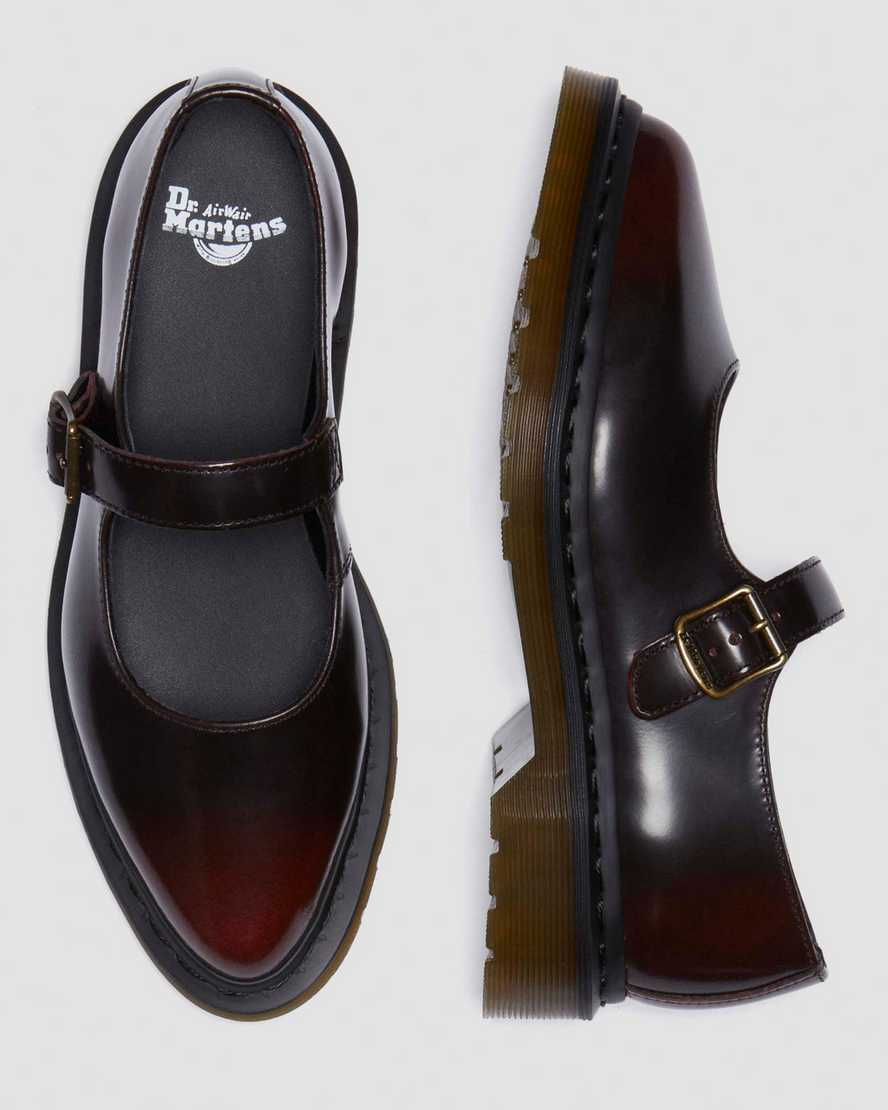 Get to the point. The Elphie Mary Jane shoe is our twist on a classic. Less dainty. More Doc??s. A pointed ballet flat shoe made from two-tone cherry red Arcadia leather designed to shift in color over time. Fastened with a single strap with a DM??s branded buckle. The tapered sole is marked with DM??s signature grooving pattern and secured with black welt stitching.