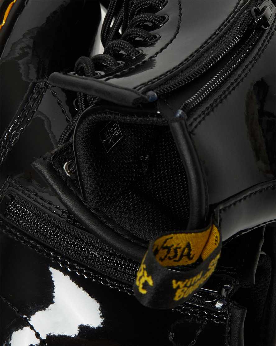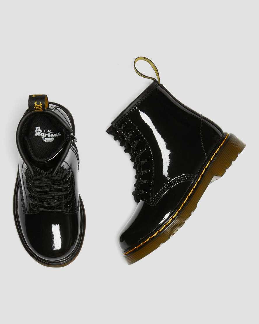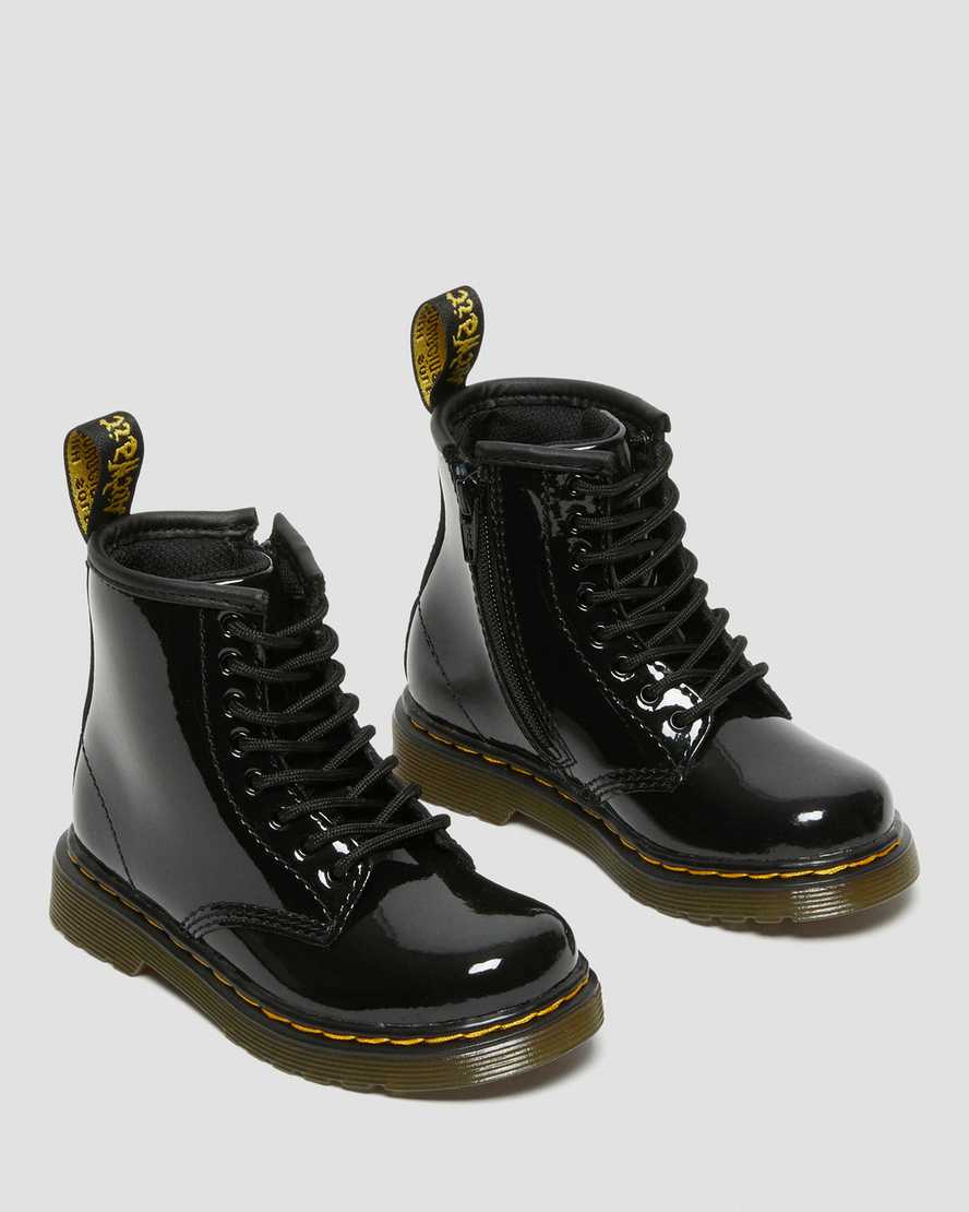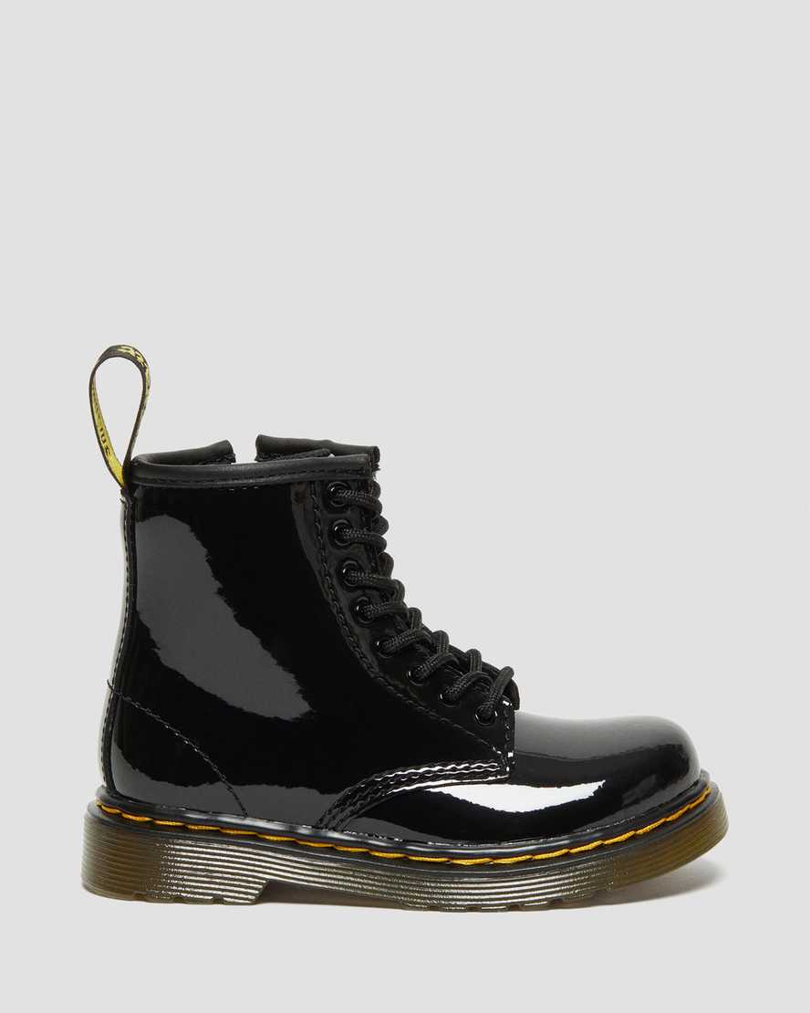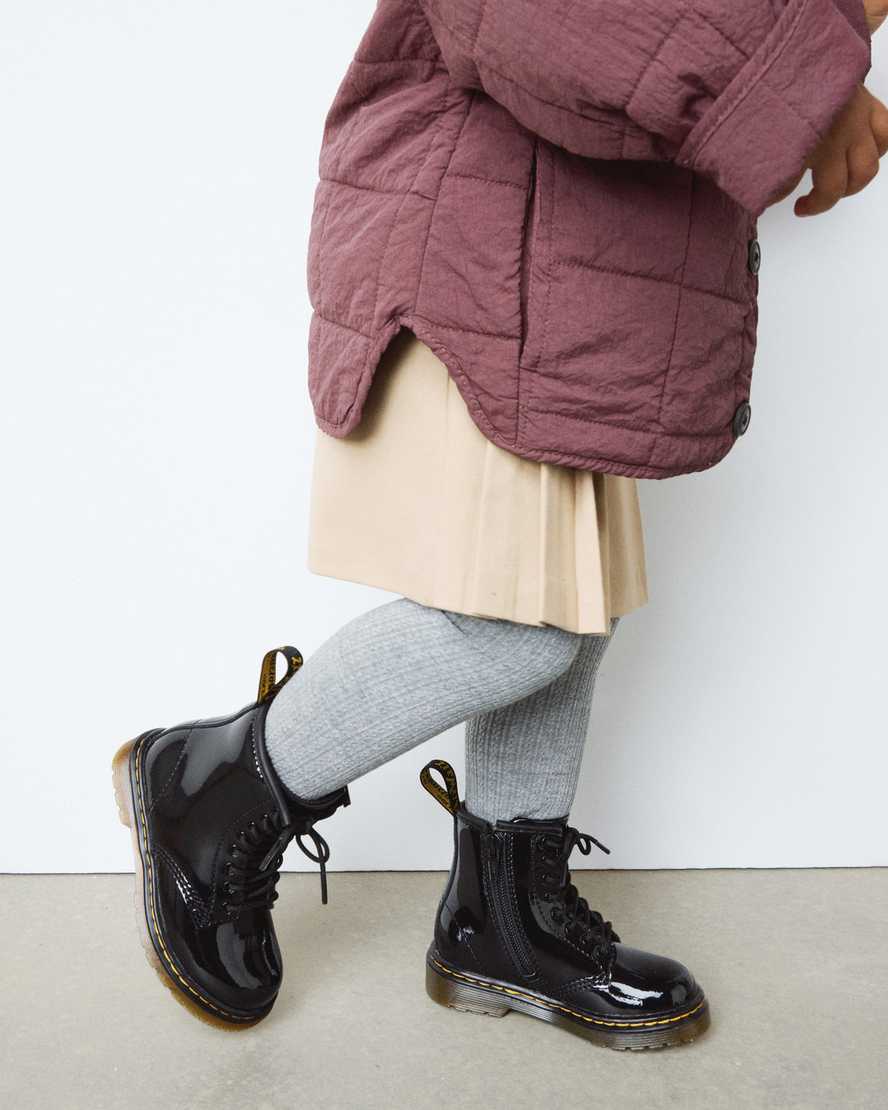 Small soles. Big attitude. Scaling down our Original silhouette, we’ve crafted mini versions of our 1460 boots for up-and-coming renegades. Built from a soft Patent Lamper leather and sitting on a comfortable, flexible sole, these toddler boots are perfect for growing feet that don’t keep still. Finished with yellow stitching and a black and yellow heel loop.