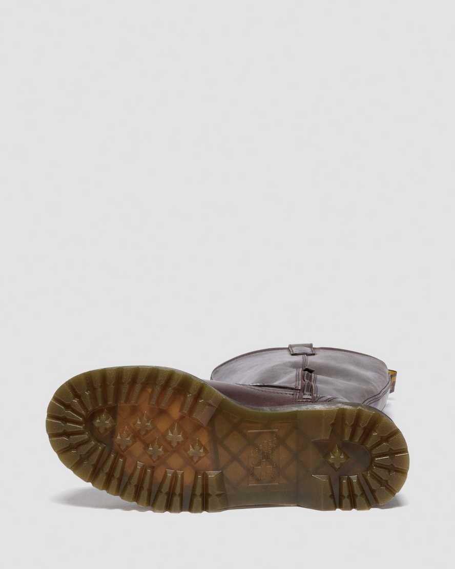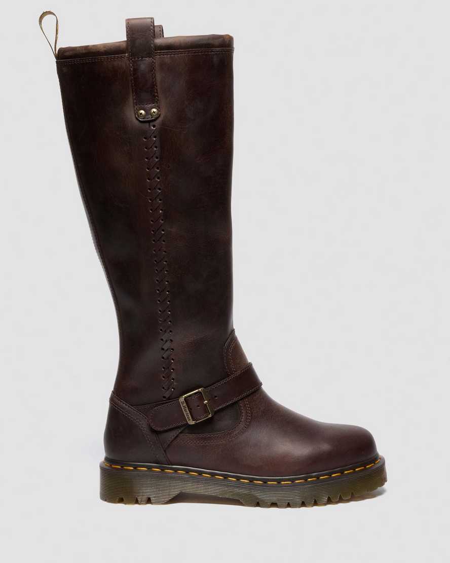 An elongated silhouette joins the line-up. This is the Anistone Knee High biker boot ÿ made taller for expression without limits. Engineered with distressed Crazy Horse leather, the boot is fitted with an antique brass buckle and our cross-rivet branding. A brown and yellow heel loop rises from the collar, whipstitch detailing runs down the side of the boot, and our signature yellow stitching lines the welt. A vintage trans Bex sole delivers extra height and grip underfoot.