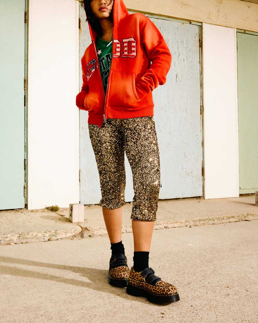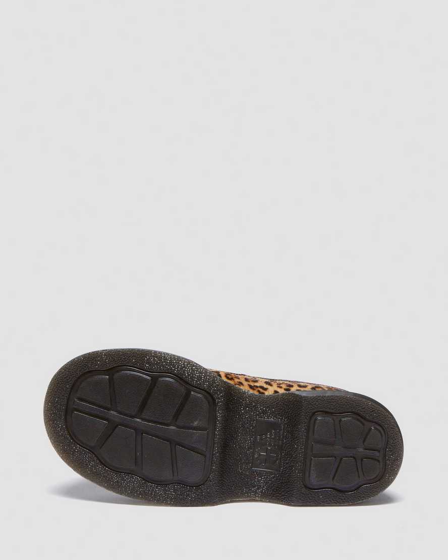 Buzzing from the sole up. The Buzz Mary Jane shoe stands on our new inflated Buzz sole. A barrel-edge PVC platform marked with DM??s grooving, yellow welt stitching, and a leaf pattern on the undersole. The upper is made from leopard print Hair On leather with a comfortable padded collar. Fastened with 2 adjustable leather straps with branded clasps.